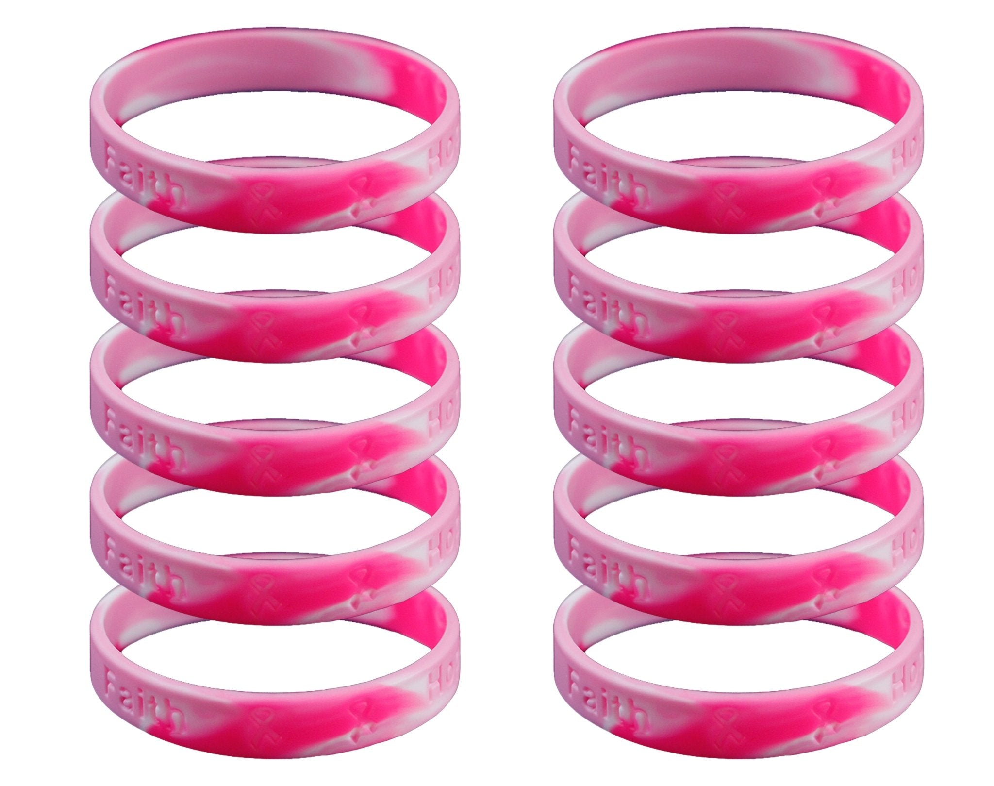 how your support and raise awareness with our wholesale pack of 50 Pink Camouflage Silicone Bracelets. Designed with a unique pink camo pattern, these eye-catching awareness wristbands are embossed with the words Hope, Faith, Love alongside ribbon designs—powerful symbols of strength, courage, and unity in the fight against breast cancer. Made from high-quality, durable silicone, each bracelet is thicker than standard wristbands to ensure long-lasting wear without breaking. Available in adult size (8 1/4 inches) and child size (7 inches), these unisex bracelets offer a comfortable fit for both men and women. Perfect for fundraising events, awareness walks, schools, charities, or honoring a loved one, their bold camouflage design and inspiring message make them stand out while spreading hope. Affordable in bulk, these bracelets are ideal for giveaways, donations, or resale at low wholesale prices. Wear your commitment proudly with these meaningful pink camo awareness bracelets.